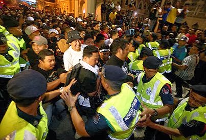 Perserta perhimpunan haram merempuh masuk penghadang yang dibuat pasukan keselamatan di Dataran Merdeka untuk sambutan ambang Tahun Batu, jam 11.03 malam ini.